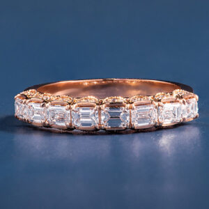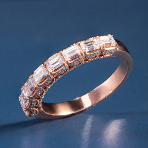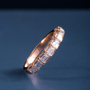 Họa lên nét yêu kiều của phái đẹp, nhẫn band nữa vòng kim cương ghi điểm với thân nhẫn làm từ vàng hồng mềm mại đính kết những viên tấm lung linh, khẽ ôm lấy viên chủ kim cương dáng tròn và tôn lên vẻ kiêu sa lôi cuốn.
