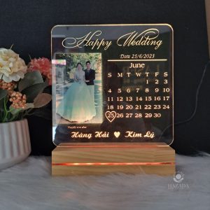 Món quà nhỏ nhưng cực kỳ ấm áp. Bạn có thể chọn loại đèn ngủ gỗ khắc tên, đèn LED đổi màu hoặc đèn hình trái tim, có khắc ngày cưới của cặp đôi.