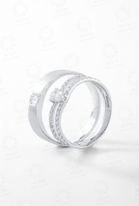Nhẫn nam với kiểu dáng đơn giản nhưng không kém phần sang trọng. Nhẫn được chạm khắc tinh xảo phần đai nhẫn nhám, viên kim cương chủ được đính giữa phần rẽ làm nổi bật lên sự lấp lánh. Nhà thiết kế đã chăm chuốt, tỉ mỉ để khắc hoạ nên chiếc nhẫn nữ với kiểu dáng độc đáo bởi viên kim cương chủ được bao bọc bởi những viên kim cương nhỏ kế bên, xung quanh đai nhẫn là 2 dải song song.