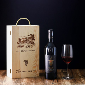Một chai rượu vang cao cấp với nhãn dán hoặc phần khắc tên, lời chúc Giáng sinh cá nhân hóa, thể hiện đẳng cấp và sự tinh tế.